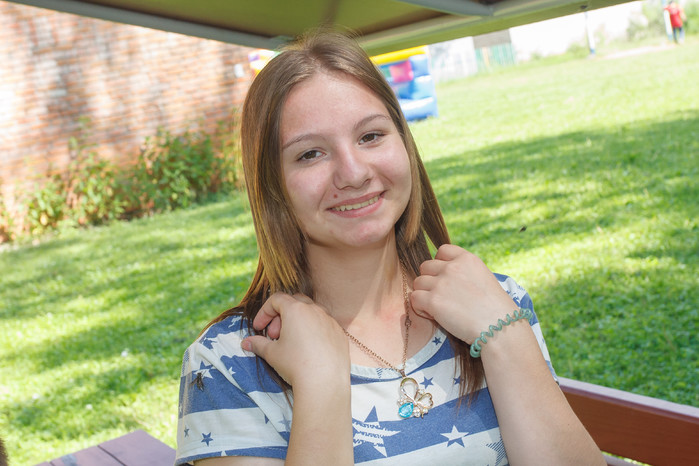 Руслан о своих любимых занятиях рассказал нам сам. Он – один из тех общительных ребят, из которых не нужно вытаскивать информацию клещами. Руслан сообщил, что дома увлекается компьютерной игрой «Стратегия», а в лагере ему нравится все, потому что много общения со сверстниками и новых для него дел. Парень сделал альбом с тигрятами и маршрутные листы. Его старшая сестра Настя пояснила, что в лагере организованы «кругосветки» - квесты, в которых нужно выполнить определенные задания. Настя тоже общительная девушка, она отвечает на все вопросы с простотой, достоинством и открытой обстоятельностью. Мне кажется, она по-своему бесхитростная и тем очень симпатична. Настя родилась в октябре 2001 года. Она старше своих братьев, поэтому относится к ним с особым вниманием, контролируя их поведение, хотя до детского дома они жили врозь. Девочка поступила в казенное учреждение раньше мальчишек. У Насти с братьями разные отцы. Несмотря на все эти условия задачи, когда члены семьи находятся в разных пунктах, отношения между ребятами родственные. Хотя конечно мальчишки больше тяготеют друг к другу, тем более, у парней небольшая разница в возрасте. Руслан родился в сентябре 2009 года, а Тимурбек – в мае 2011. Я не стала рвать душу Насти и выяснять подробности всей их непростой предыдущей жизни, из-за которых лишили родительских прав их маму. Девочка лишь сама оговорилась, что врачи выправили Руслану глаз, «а потом случилась трагедия, и он снова стал косить». Сама Настя - девушка, но с характером, и в обиду не даст ни себя, ни братьев.