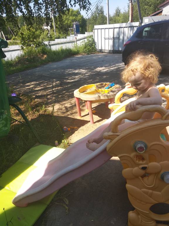 После врачей вышли на улицу, в этом ЖК большая детская площадка, но народу там жуть, наша рванула "Горка, качели!! Почти все дети лезут на горку, где скатываются и только моя бежит к лестнице. В итоге моя скатывается и утыкается в очередного снизуползущего. Хорошо у нее босоножки мягкие. Я одна ношусь по площадке элетровеником, остальные чинно сидят по лавочкам. Прямо позавидовала из спокойствию. Хотя муж тоже так с ней гуляет, сядет и наблюдает, а она носится, а если, что случиться, так там другие мамашки есть помогут "одинокому мужчине". Когда ушли с площадки до меня дошло, что я не сняла бахилы
