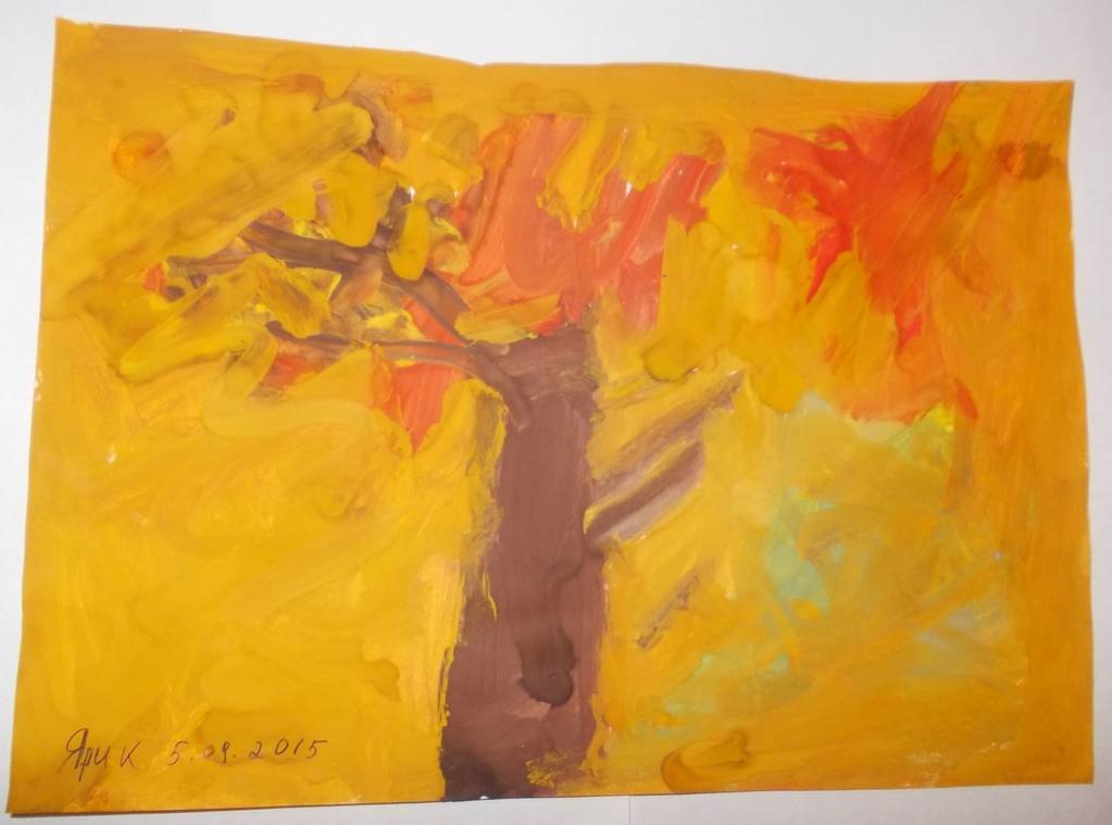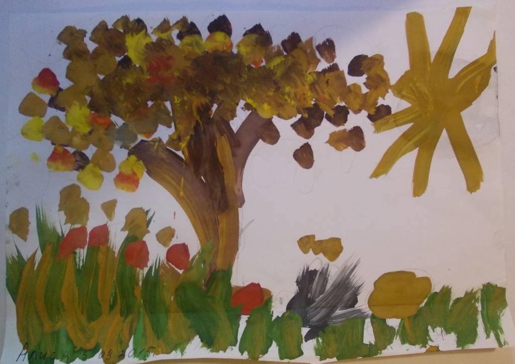Сегодня на рисовании были, тема осень. Должно быть дерево и солнце, все остальное по желанию, вот такие разные работы получились.