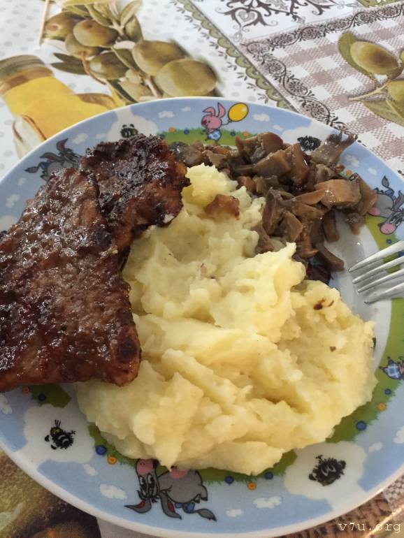 А вот главный секрет пюре, это при варке кладу туда несколько зубчиков чеснока, и воду сливаю и оставляю воду потом для супа) ). Вот сначала картошку мну без всего, а вот потом туда всегда лью подогретое молоко, у меня сегодня козье (нам нельзя простое), потом туда же тру на мелкой тёрке , мускатный орех, и там же сразу растапливаю масло сливочное, в моём случае сейчас сильно экономлю)) Пюре потрясающее или я так соскучилась.