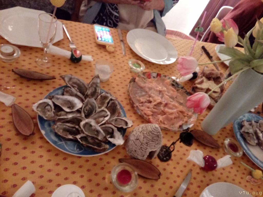 Французский новогодний стол. Холодные закуски: устрицы, копченый лосось с багетом. На горячее: запеченая баранья нога с отваренной в мундире и зажаренной картошкой и отваренной и пожаренной с луком зелёной фасолью.