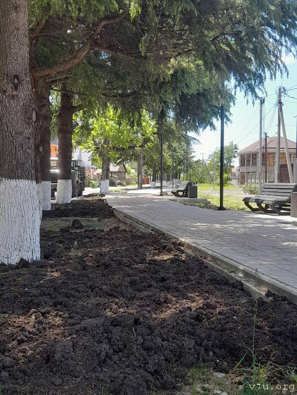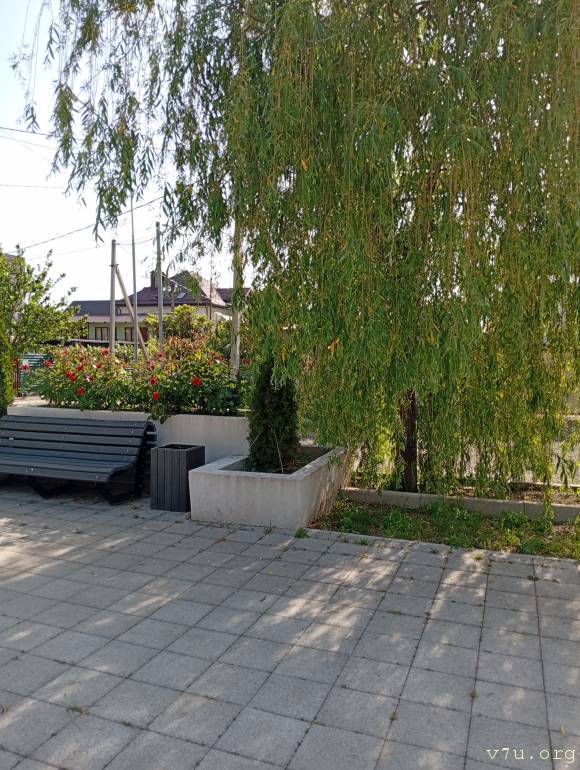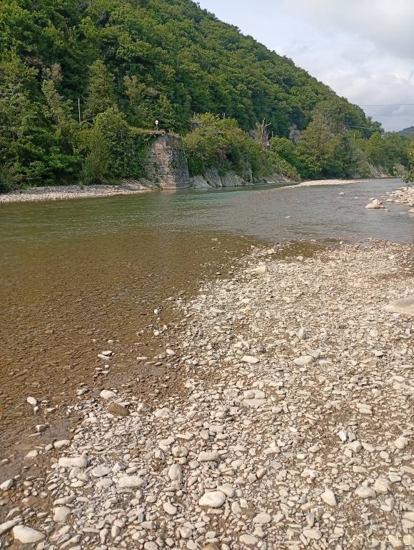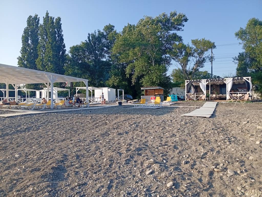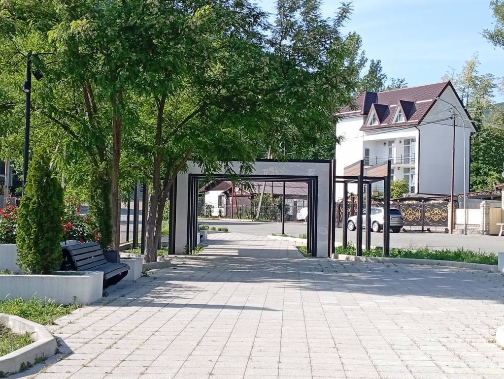 5 минут пешком по ровной тенистой аллее. Без Горок. Рядом река горная. До нее 2 минуты.