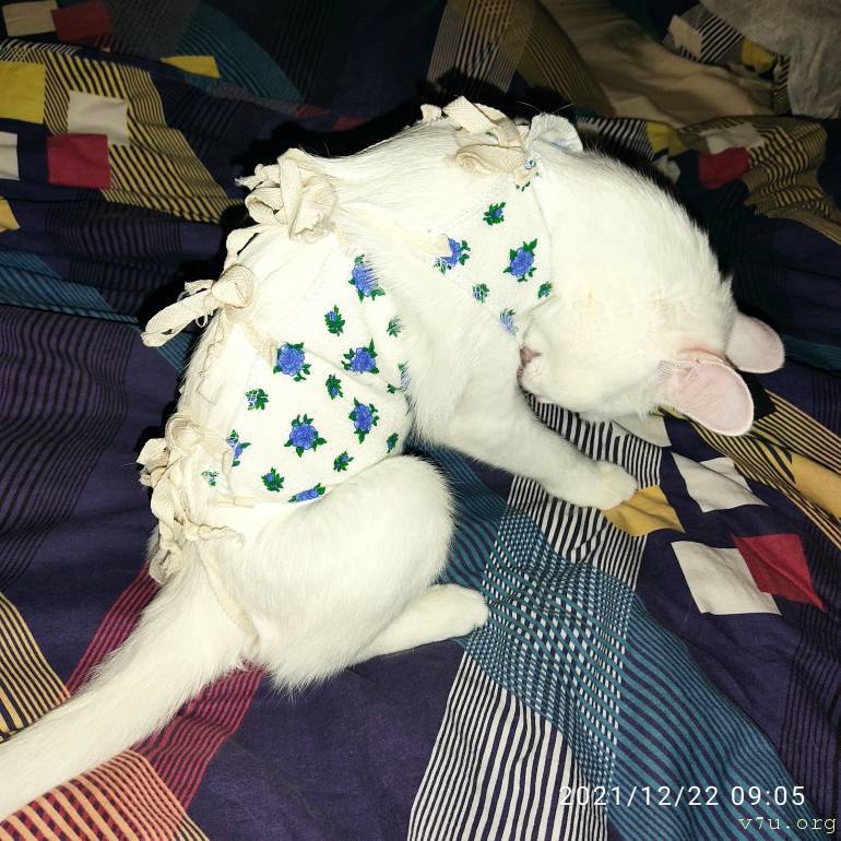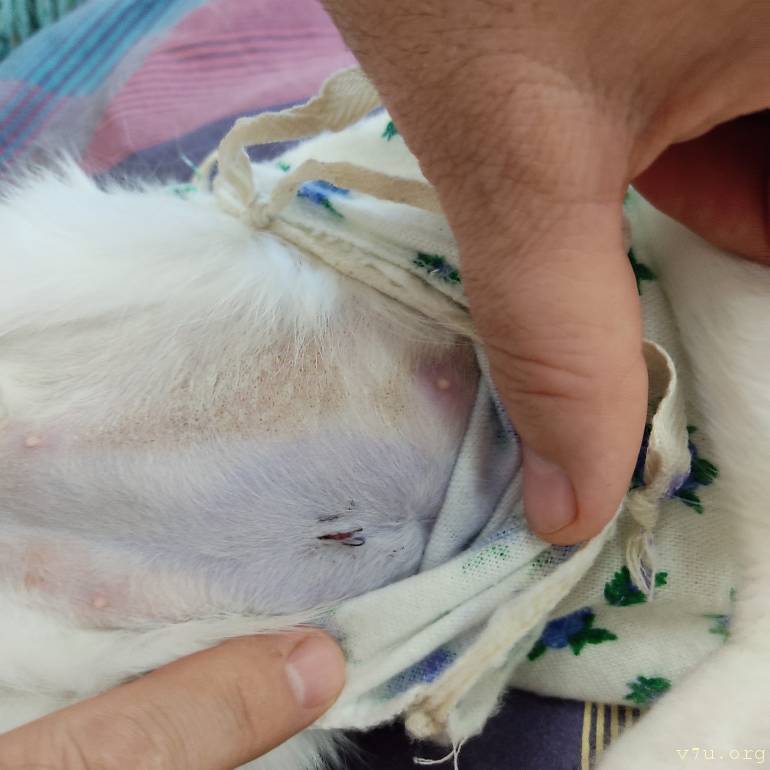Шовчик на пузике маленький, в ветеринарке брызгали фиолетовым антисептиком, поэтому кожа голубоватая вокруг