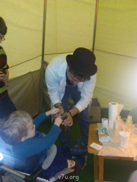 Выдержал все мероприятие. Даже 3D мультики смотрел (в прошлый раз испугался и ревел, а сегодня 2 раза сам просил).