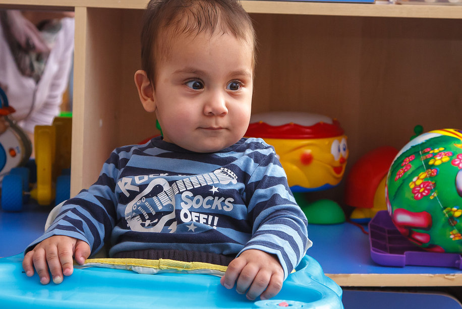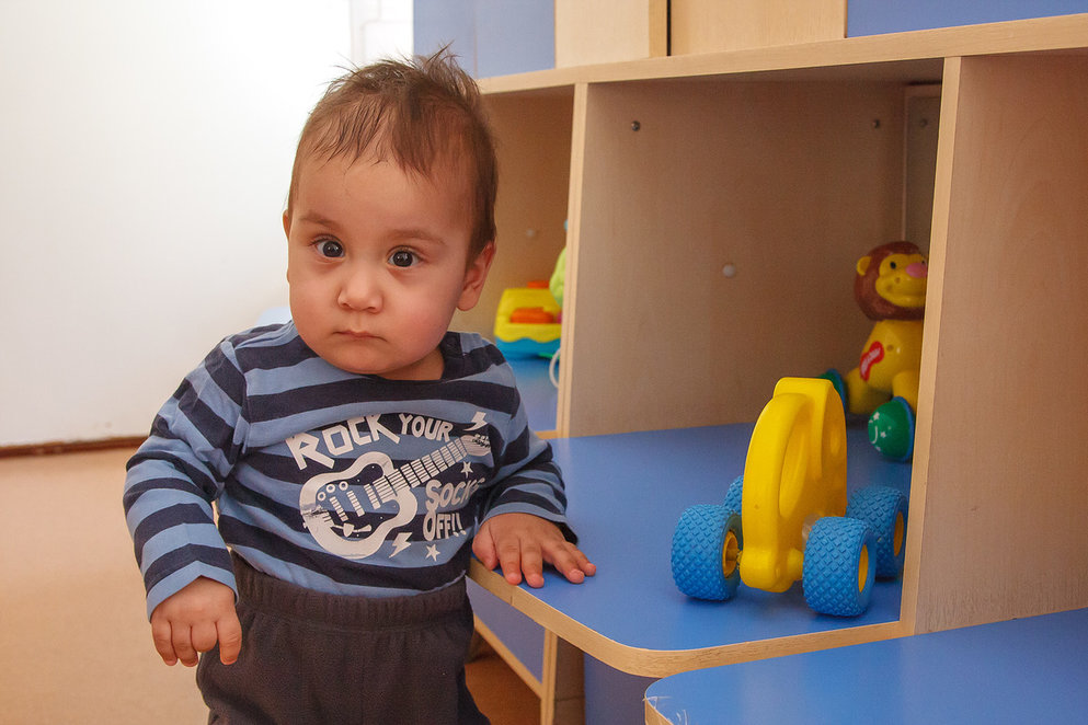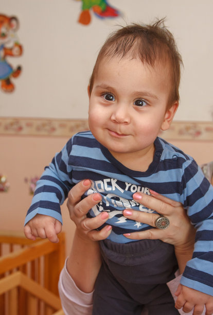 Итак, что можно рассказать для будущей приемной семьи этого очаровательного черноглазого годовалого мальчика? Для своего возраста Ваня слегка отстает в ожидаемом развитии. Например, он пока не умеет ходить. Правда, усердно пытается вставать, находясь в манеже. Ваня проявляет интерес к ярким игрушкам. По характеру ребенок спокойный, хорошо спит и ест. Как рассказывают воспитатели, Иван – человек общительный, любит, чтобы с ним разговаривали и играли. Но незнакомых людей он принимает настороженно. Судя по фотосъемкам, Ваня - парень с чувством собственного достоинства. Чтобы мальчишка заулыбался, нам с воспитателями пришлось основательно поплясать вокруг него. Приемные родители хорошо знают, что такая реакция на посторонних – хороший признак для малыша из системы. У Вани третья группа здоровья. Однако ребенок требует не только внимания врачей и воспитателей Дома ребенка. Это все у него есть. Но нет у Вани семейного тепла и любви. Очень надеемся, что телефон для звонка в опеку, чтобы все узнать об этом темненьком мальчишечке с восточинкой в глазах, уже в руках его будущей мамы.