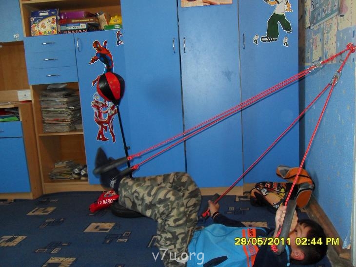Девочки ,как и обещала. Сегодня муж прикрутил в игровой крючок,обещал купить карабин,тогда я могу заниматься хоть где. Забавно,но сегодня уже никто не смеётся. Папа наш,бывший спортсмен,опробовал мои верёвки и сказал на полном серьёзе: толк будет,только регулярно занимайся, во всяком случае коленки свои больные разработаешь.Попробовала 3 минуты. Спина мокрая,надо хороший коврик купить. На скозняке не заниматься. Пресс качает классно. Меняешь положение верёвок и качаешь. вот фотки.