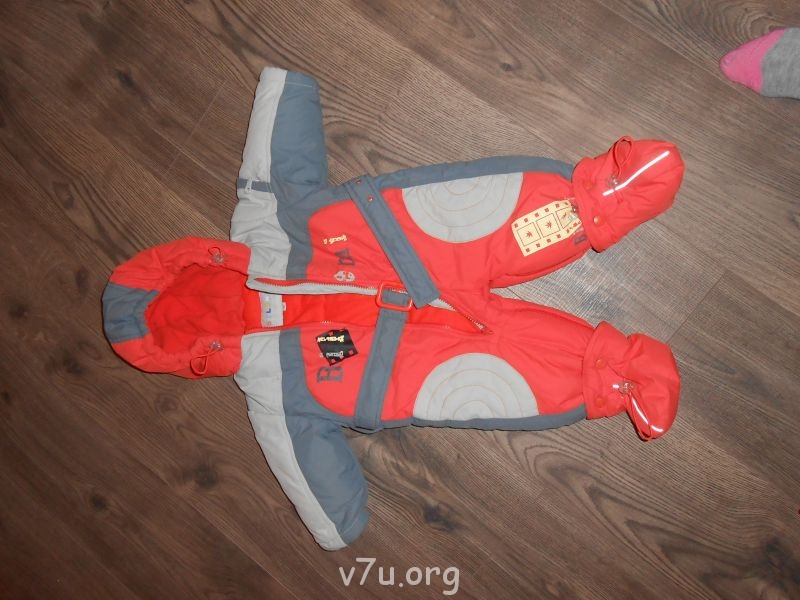 и комбинезон, пышный, теплый, на синтепоне с флиской внутри. варежки и боты пристегиваются. размер 62.
