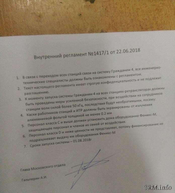 "Знакомый, работающий на местного телефонного оператора, рассказал, что к нам в город завезено оборудование более чем на 100 млн руб!!! При этом НЕ закуплено, а завезено. Это всё кем-то спонсируется. Регламент №1417/1 от 22.06.18г. говорит о какой-то системе "Гражданин - 4", которая должна запуститься 01.08.2018г. за подписью Гальперина А.И.