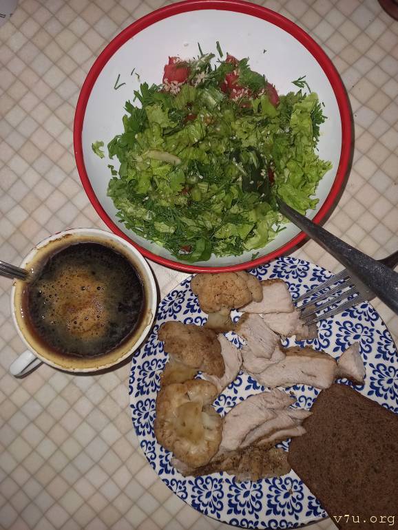 Мясо, овощи, салат с маслом и кунжутом, первое не ежедневно, не люблю...