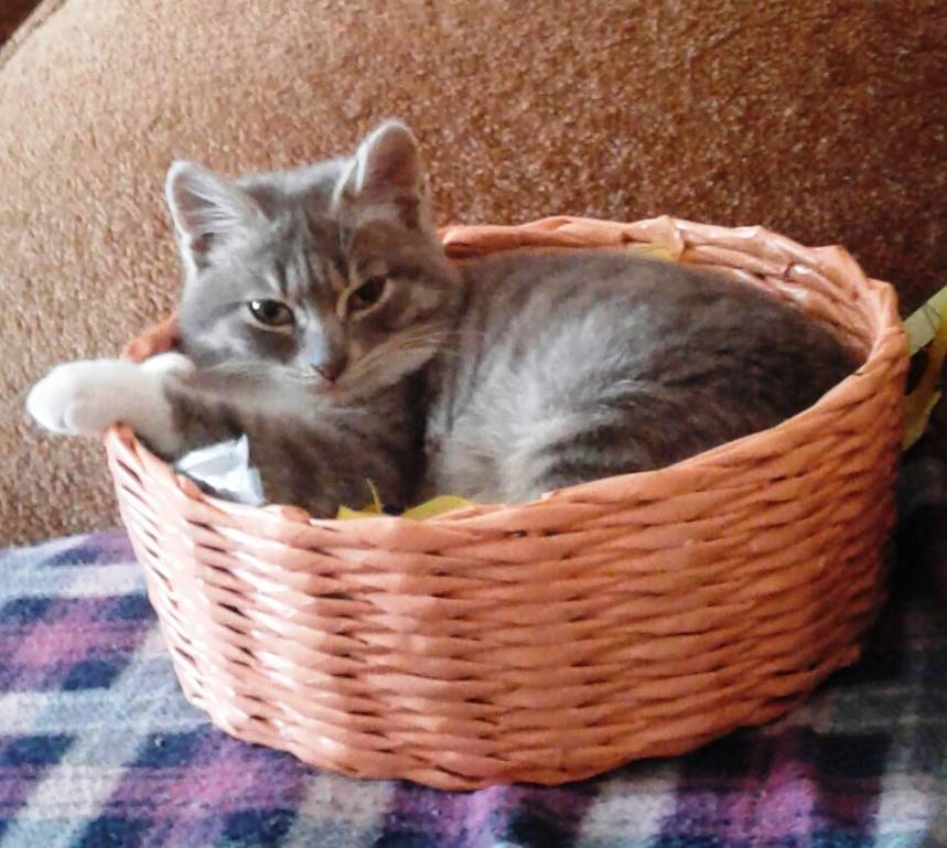 Мне вот всегда жалко выбрасывать такие рулоны, да и вообще хороший картон. Я как Плюшкин, то баночки необычной формы для декупажа припрятываю, то коробочки... Из упаковок от зубной пасты можно аэропланы смастерить или крепости. А для котиков я бы степлер заменила на обычную толстую нитку (просто прошить толстой иглой детали),и еще меня перья смущают. Кошкам не вредно их покусывать? Погремушка больше всего понравилась. Вышлю сестре видео, у нее две кошки. Она прошлой зимой плела корзинки из газетной бумаги, потом красила их. Так кошки охотились за этими деталями- тонкими трубками из газет. На фото кошка Дуся (Дульсинея) в готовой корзинке.