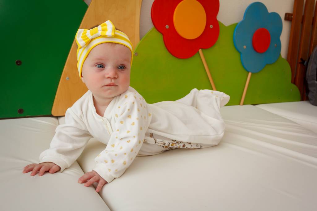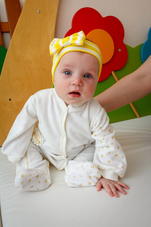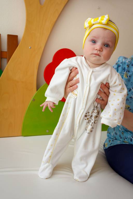 Между тем, Сашенька – настоящее чудо. Внешне она – просто красавица, а по характеру доброжелательна и не пуглива, но с правильными реакциями на незнакомых людей. Сейчас Саша учится сидеть. Воспитатели рассказывают, как она планомерно добивается результата.