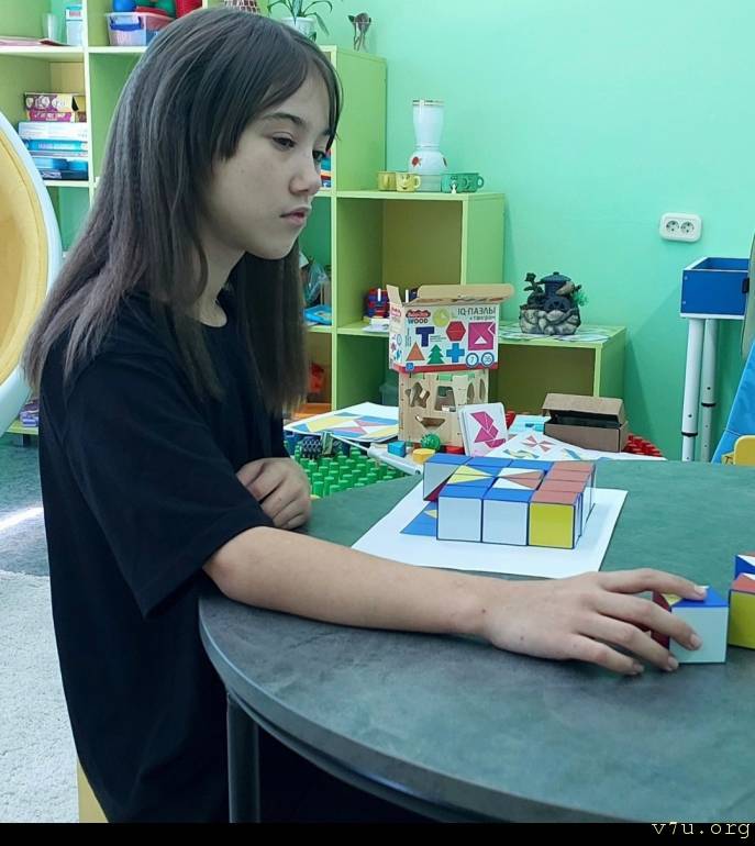 Удалось немного пообщаться с Дашей. Видит она вполне прилично, для ребёнка из спец школы для слабовидящих ( с 4 метров вполне различает некрупные предметы), рассказала мне,что раньше училась в спец школе, а теперь в обычной. Какие капли в какой глаз капает и зачем тоже сказала. Есть дефекты речи. Но все по теме и адекватно. Маленькая, выглядит лет на 7. В этот раз была бойкая и активная, хорошо шла на контакт.