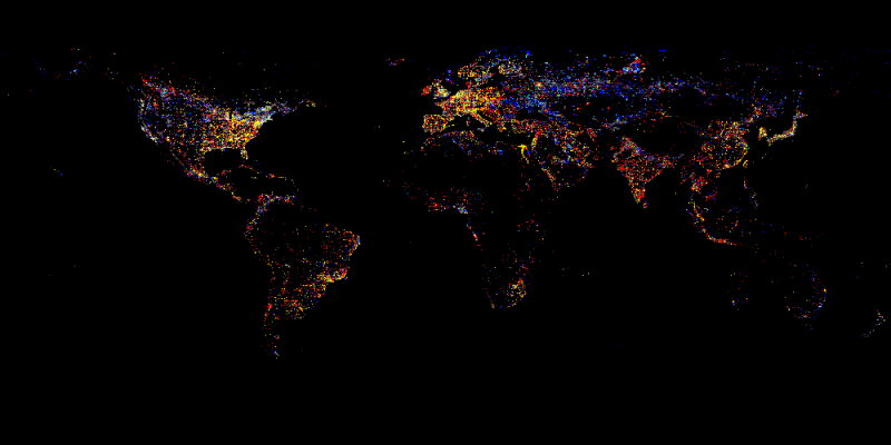 National Oceanic and Atmospheric Administration собирает фото Земли с 4 спутников. Дневные фото — скучная штука, а вот ночные представляют особый интерес. Дело в том, что там где ночью есть свет — там есть люди, которые его включают, и электричество, которое его питает. А там, где ночью света нет — там нет жизни. Либо есть — но нет электричества. Наблюдения ведутся с 1993 года. И ночное фото десятилетней давности и сегодняшнее — можно наложить и получится интересная картинка.Каждый цвет точки имеет свое значение, показывающее изменение интенсивности освещения. Самые интересные: красный — ночной свет в этой точке появился, теперь там есть активная жизнь; Синий — свет (жизнь) ушли из этой точки. Россия - страна синих точек.