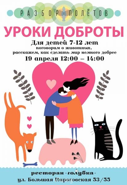 Приглашаем Вас и Ваших детей на «Уроки доброты» в ресторан «Голубка». Представительница благотворительного фонда «Дарящие надежду» расскажет детям о зверях, мы будем рисовать, собирать кормушки для птиц, а Вы получите замечательно возможность отдохнуть пару часов, посидеть в ресторане или прогуляться по Новодевичьему монастырю или парку.