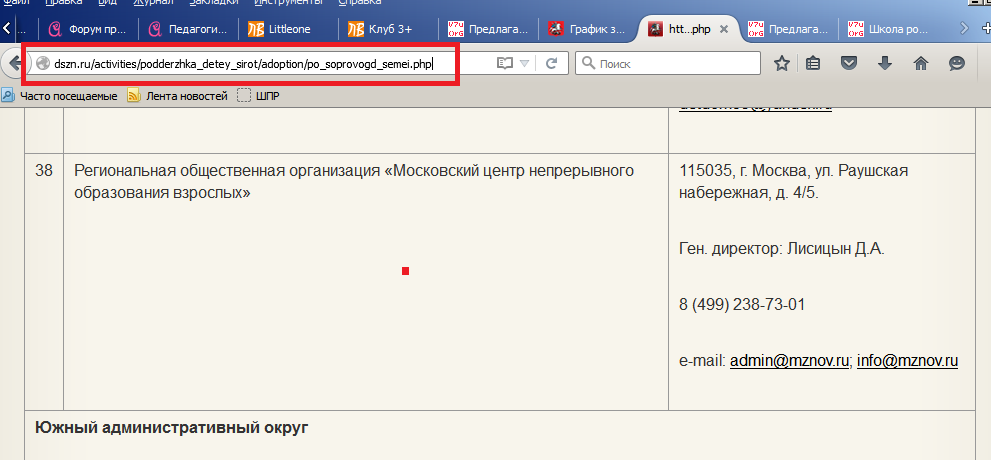Региональная общественная организация Московский Центр непрерывного образования взрослых предлагает услуги по сопровождению семей, взявших на воспитание трех и более детей, лишившихся родительской заботы. Речь идет о помощи в трудных ситуациях, в первую очередь психолого-педагогическая поддержка, различные консультации, ответы на вопросы, а кроме того - приглашения на спектакли, выставки, новогодние елки. Все эти "услуги" предлагаются абсолютно бесплатно!!! На всякий случай подчеркиваем: мы ничего не собираемся навязывать насильно, только предлагаем помощь!