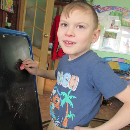 В своей группе он по росту самый маленький. Дима тихий, застенчивый мальчик, задумчивый и ласковый. Его воспитатель очень тепло отзывается о мальчике! После занятий Дима помогает ей расставлять стульчики на место.