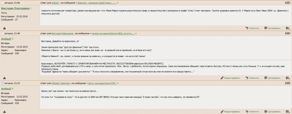 Начинается сообщение: "почему не нашли брата в ФБД, он есть, его зовут Ваня.. Иван Б. " Далее анкета... А в следующем сообщении (попробую скрин картинкой... мож пройдёт) идет полуправда. И вот это-то, ради чего тема эта (дописано Викторией - жирным)